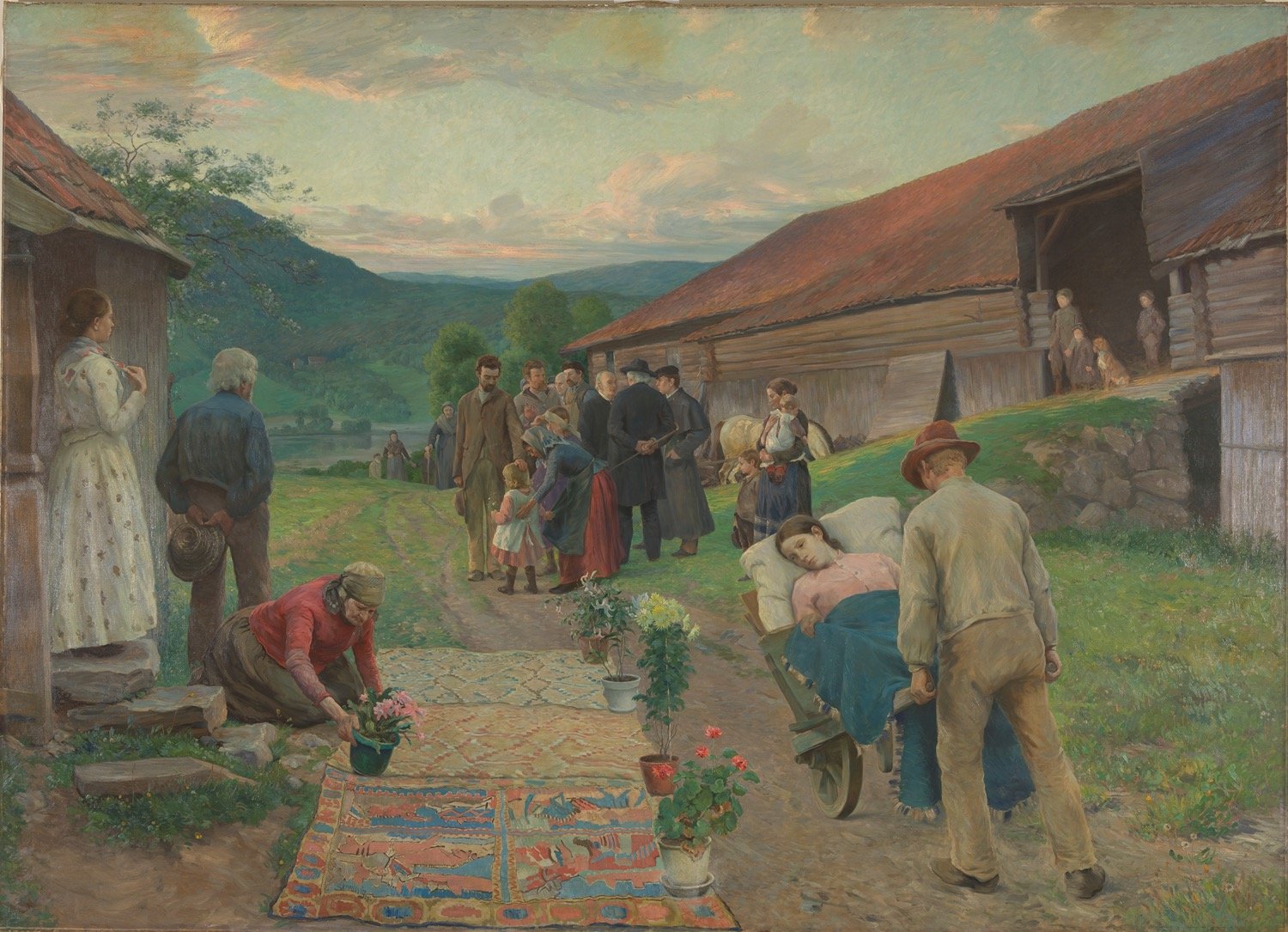 The women of the farmstead have laid their best rugs on the ground and we see a man dressed in humble working clothes entering the farmyard. He lays his hand on the head of a little girl, and coming towards them is a man pushing a sick young woman on a wheelbarrow.