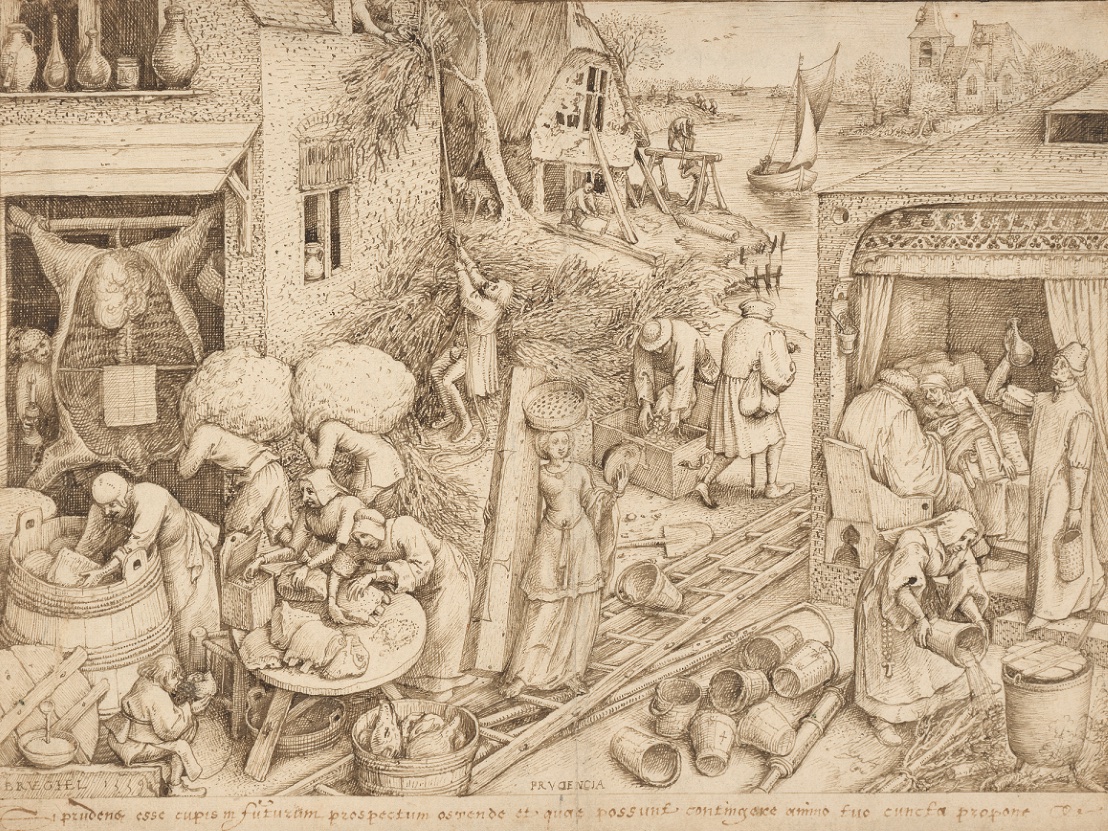 In addition to prudence, temperance, justice, courage, faith, hope, and love make up the other virtues in this series. A few years earlier, Bruegel had completed the series of "The Seven Deadly Sins". At the same time as the symbolic representation, the detailed drawing reflects everyday life and reality in a direct way that was characteristic of Bruegel's works.