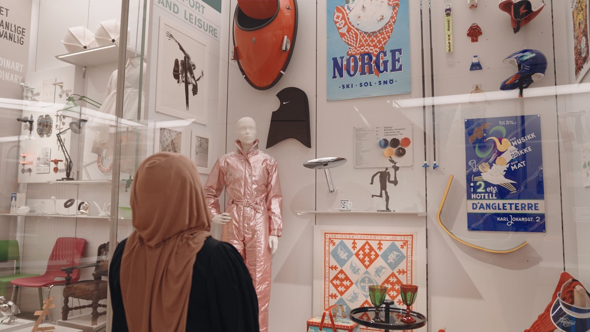 Vis bildet "Iman synes det er fint å se Nikes sportshijab utstilt i museet." i full størrelseIman synes det er fint å se Nikes sportshijab utstilt i museet.Foto: Vjus Se mer av Imans samling her H.M. Dronning Mauds Hardangerbunad Skrik Valkyrjen
