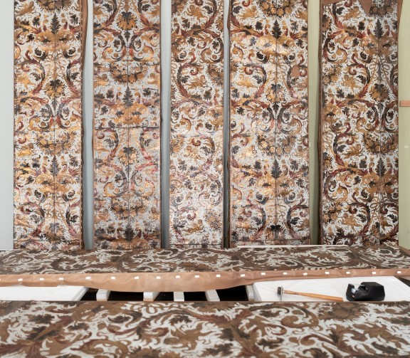 The gilded leather wall covering measures about 25 square metres and we’ve cleaned it, reinforced holes, cracks and the edges with leather, and mounted it on custom-made stretchers. The conservation project has now been completed, and we’re looking forward to seeing it in the National Museum.