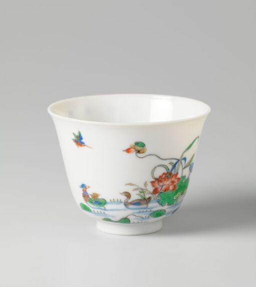 Dreiet porselen med underglasurdekor i blått og emaljemaling over glasuren