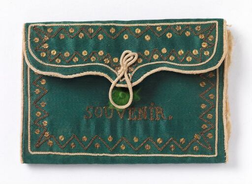Silkestoff i satengbinding håndbrodert med silketråd, metalltråd og -paljetter, avstivet med antatt papir og fôret med silkestoff i toskaftbinding, kantet med silkebånd, trådhempe, håndsydd
