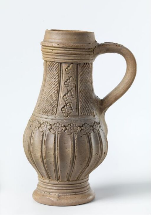 Dreiet og modellert stengods med saltglasur og presset dekor