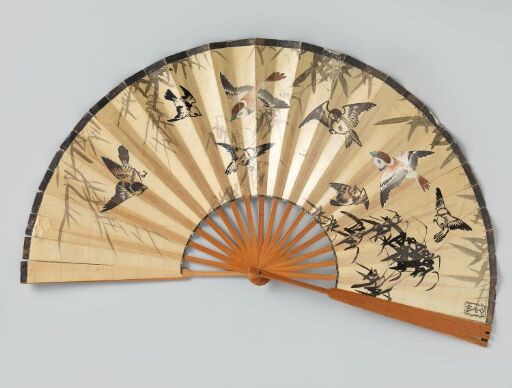 Stell av skåret bambus, skjerm av antatt trykket og håndmalt pergament, metallnagle, liming