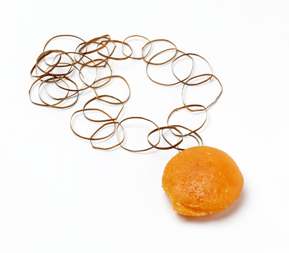Heuser has treated the lump to harden it, which has also given it a golden surface. It all has a very golden and refined appearance, and the lump of fat resembles a rather tempting, slightly golden-coloured morsel of sponge cake. But when you find out what the pendant is actually made of, it’s fair to say that it simultaneously seems pretty repulsive. Perhaps the main intention is to make us reflect on the significance of this piece of jewellery; perhaps the maker wants to steer us towards thinking about the western world’s obsession with beauty and the beauty industry … in that sense, the necklace is a symbol of an excess of body fat. In other words, something that we have too much of. Which perhaps also has something to do with our food culture in the western world – we have plenty of money and perhaps we binge on more and more sweet foods and move around less. This brings me to another satirical element here: subjecting oneself to a liposuction procedure is actually pretty expensive, so in fact this pendant is made from a rather costly material. And perhaps one could interpret it as an amulet. You’ve had this malign substance removed from your body, but now you carry it around with you as if it has some form of magical power that will ensure that you don’t lose your beauty.