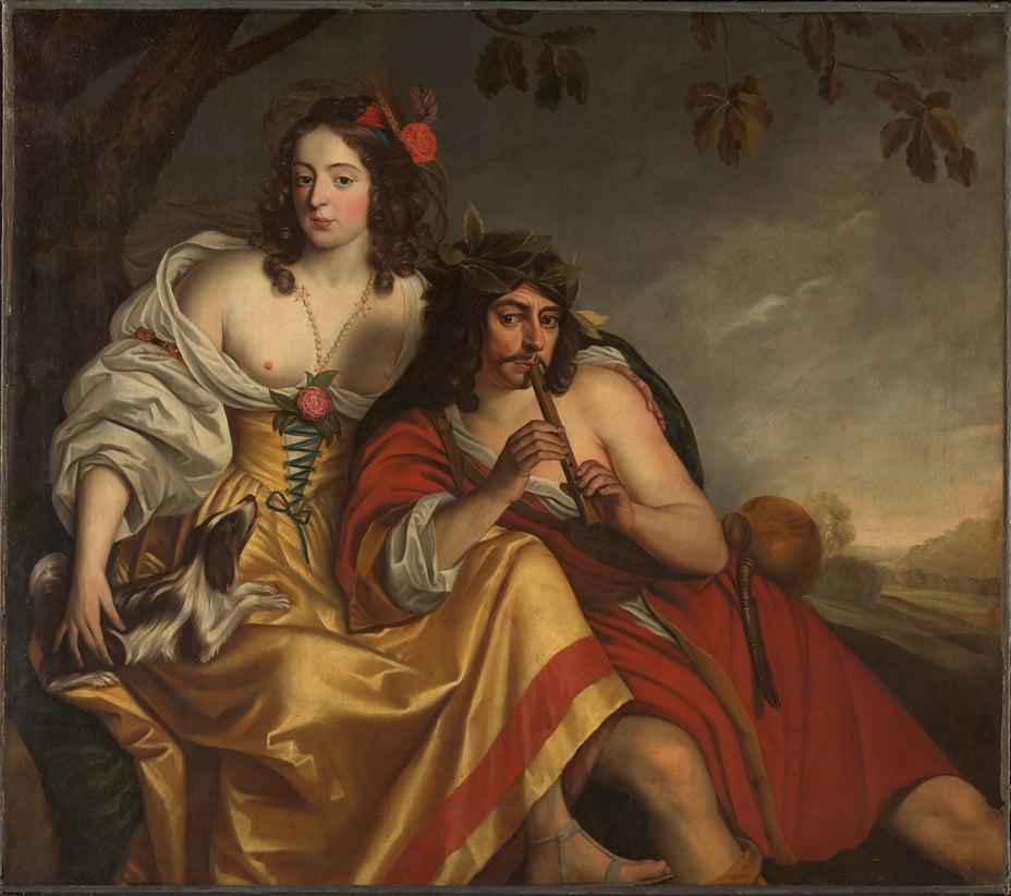 You are standing in front of a carefully considered PR stunt from the seventeenth century. A princess in an extremely low-cut dress that exposes her breasts, and a duke holding a recorder, wearing a wreath on his head. Why were a royal couple depicted in this way, dressed up as mythological figures?