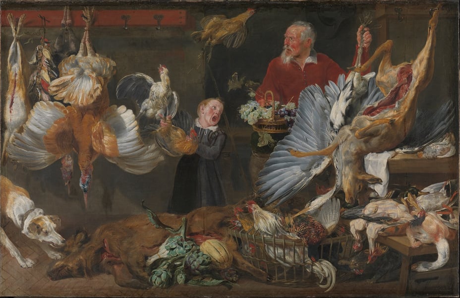 Perhaps Snyders’s mother was planning to serve a dish of roasted chaffinches. The birds – which would have been eaten whole – would have been bought from a game butcher like this one. Because here we see every kind of meat that could be required for a lavish meal – meat lying on the floor, meat hanging from hooks, and meat that’s still squawking or chirping.