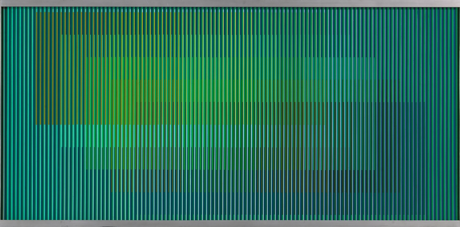 In this work, it is precisely these green, thin strips of plastic that filter and reflect the light in different ways, depending on where you are standing. When you move around and change your viewpoint, that’s when the artwork really emerges. The colours change, new patterns emerge, it’s almost as though something magical happens.
