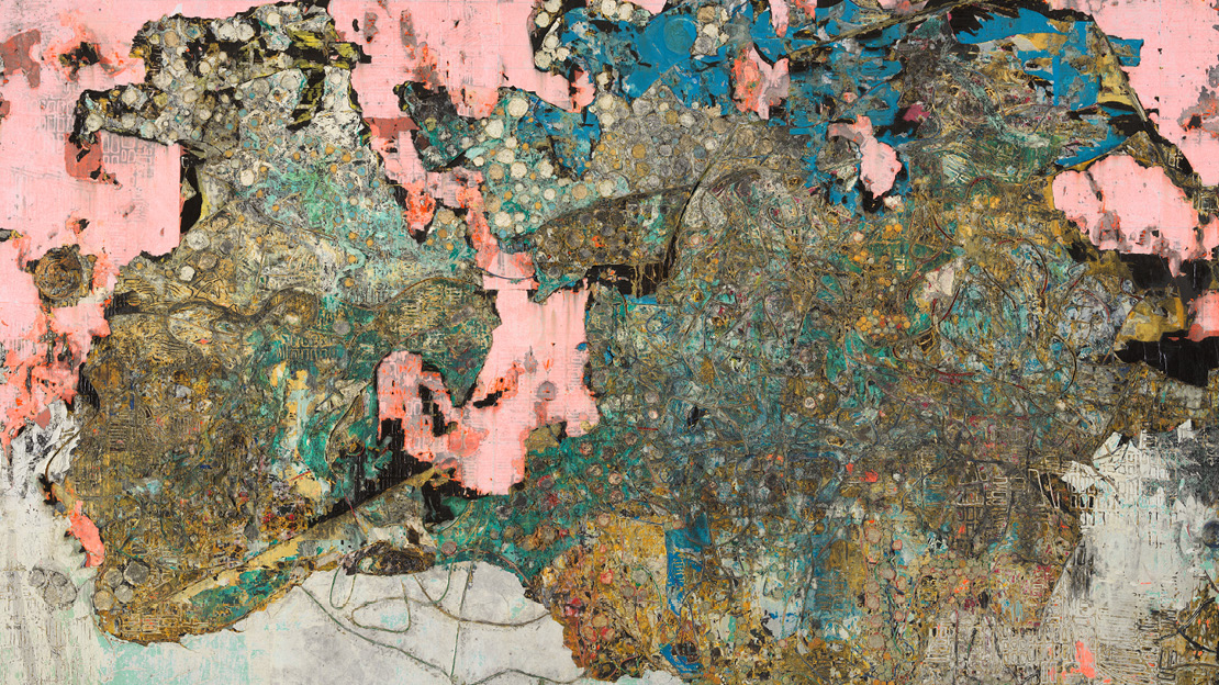 Using a sander and a high-pressure cleaner, Bradford has “excavated” the motif from this paper pulp. The result is a kind of subway map of the lives of the urban poor in the big cities from which he samples the material.