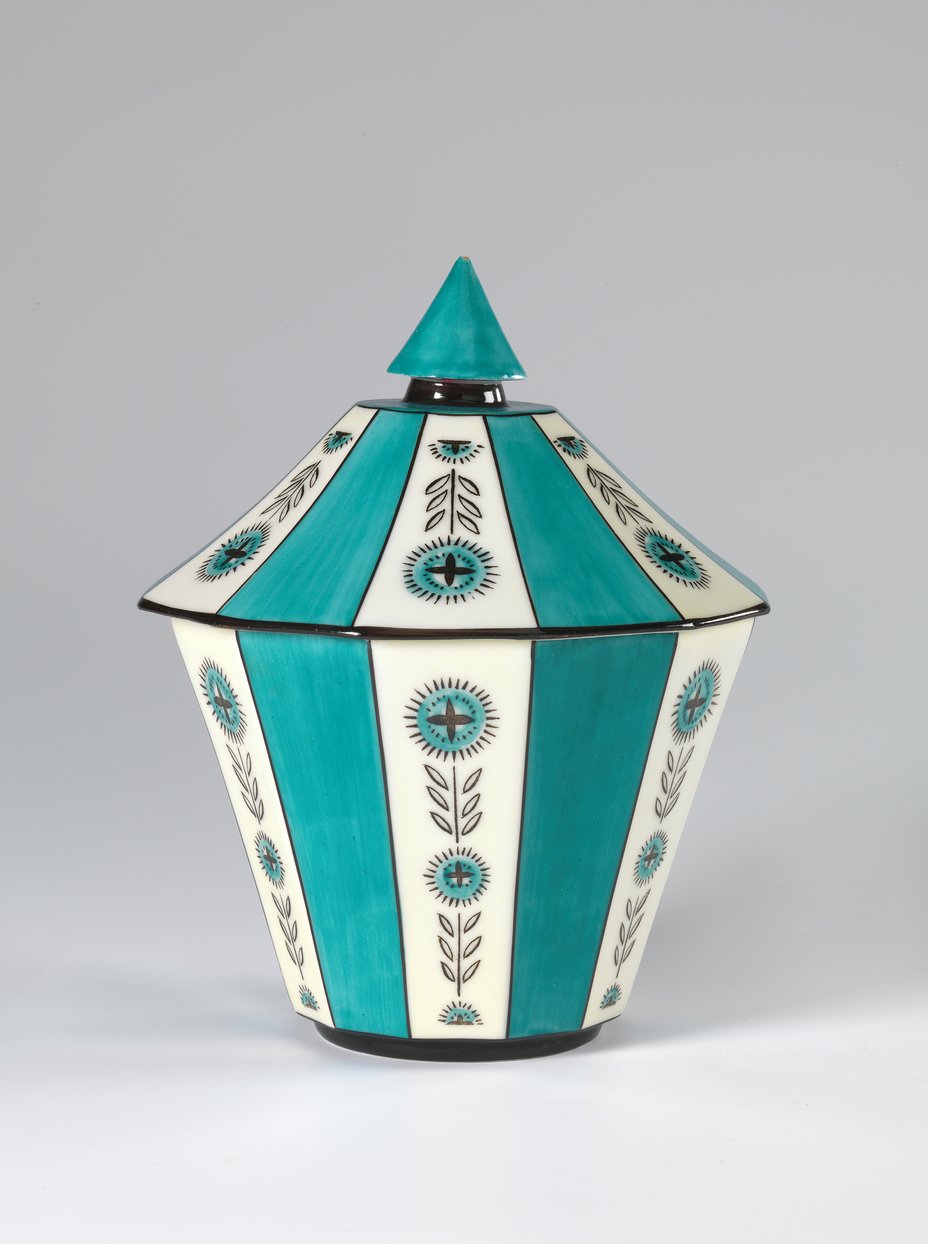 This is porcelain taken out of the comfort zone in a way, this is porcelain with strong colours and contrasts, lines, stripes, strict geometric decorations, sharp colors, gold edges. That's the funny thing about gold trim, some maybe think of it as conservative or old fashioned. But Nora Gulbransen put the gold down in the grooves, gilded geometric lid knobs that are set like little jewels. So, Nora Gulbransen is like a French jeweler who manages to turn porcelain into a new type of modern object of splendour.