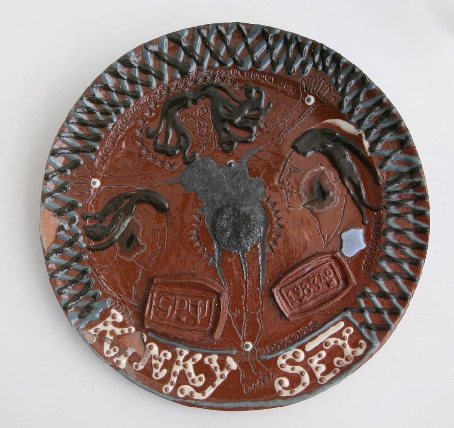 The first plate that I ever made was this piece called “Kinky Sex” which I made in 1983 and it's very much in that early English slipware style in the sort of crosshatched border decoration, and it has a picture of a kind of crucified figure in the middle. Very roughly drawn, and I think I was sort of interested in what would happen if I put in things like bits of coloured glass or a coin, and I put a coin over his groin and it kind of melted. So it's sort of like he's sort of ejaculated money and and I and I put it underneath. I put it in very bold text the words “Kinky Sex” 'cause you know I was young. I was very into fetishism at the time. And still am, and so it was kind of state. It was almost like a declaration of this is what my work is going to be about, and I I haven't really changed.