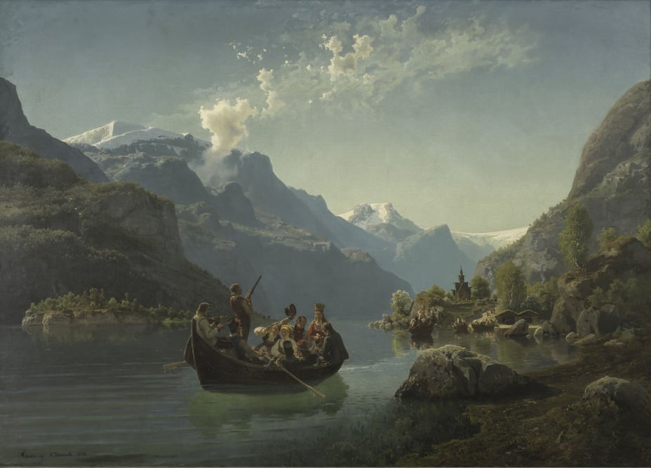 Here you can see Tidemand and Gude's lesser-known version of Bridal Procession on the Hardangerfjord, painted in Christiania in the autumn of 1848, where Ole Bull was the model of the fiddler in the boat.