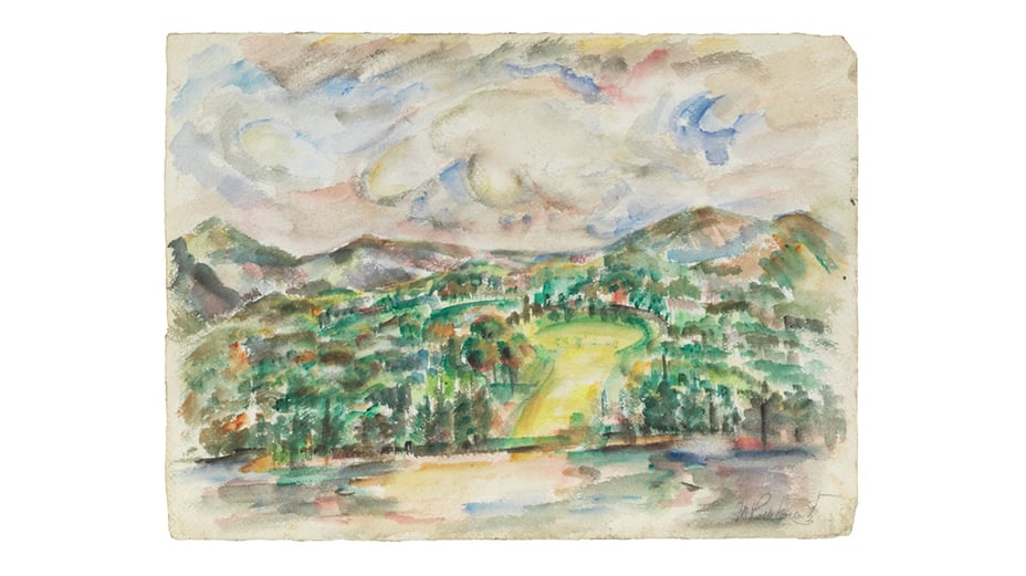 Rothko tried to reproduce this in watercolors on paper. With easy-flowing paint and quick strokes, he captured moments from the journey back to his former home. While some of the paintings show buildings and bridges seen from above, others show forests with trees standing close together.