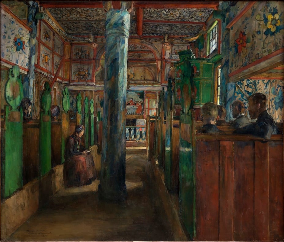 Med eitt står vi midt i eit trongt og fargesprakande rom. Vi er komne inn i ei lita stavkyrkje, med all si overdådigheit av tømmerverk, fargar og rosemåling. Vi ser innover ein smal altergang. Midtstolpen står i vegen for oss, likevel blir blikket vårt leia mot alteret. Lyset som fell inn frå vindauget, skaper blikkfang.