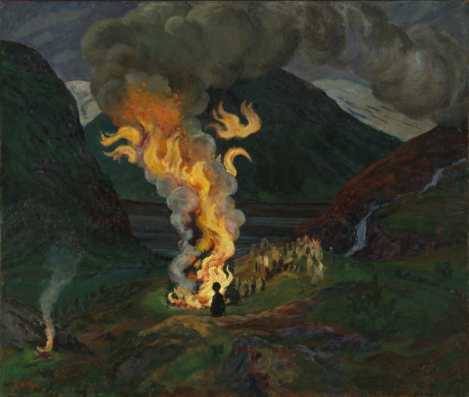 Det var jo en stor tradisjon for å feire sankthans, i Jølster og egentlig rundt om i Europa. Stor fest, stort bål, musikk og kanskje litt mat. Og veldig interessant at Astrup maler det motivet så mange ganger. Og man kan se mange forskjellige aspekter ved den feiringen da.