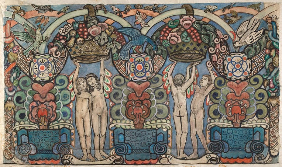 I dette rommet så er det et arbeid som er nøkkelen til å forstå hele rommet, og det er Oluf Wold-Tornes dekorative frise, en akvarell fra 1918. Det tar opp i seg elementer som er svært tradisjonelle: rosemaling, husflid. Og norske kunstnere på denne tid, 1890-tallet, tidlig 1900-tall, de gjenoppdager på et vis den norske folkekunsten, altså rosemalingen. Og de legitimerer dette ved at dette er ikke nostalgi eller noe tilbakeskuende, dette er noe de kan ta med seg i sin moderne og modernistiske kunst.
