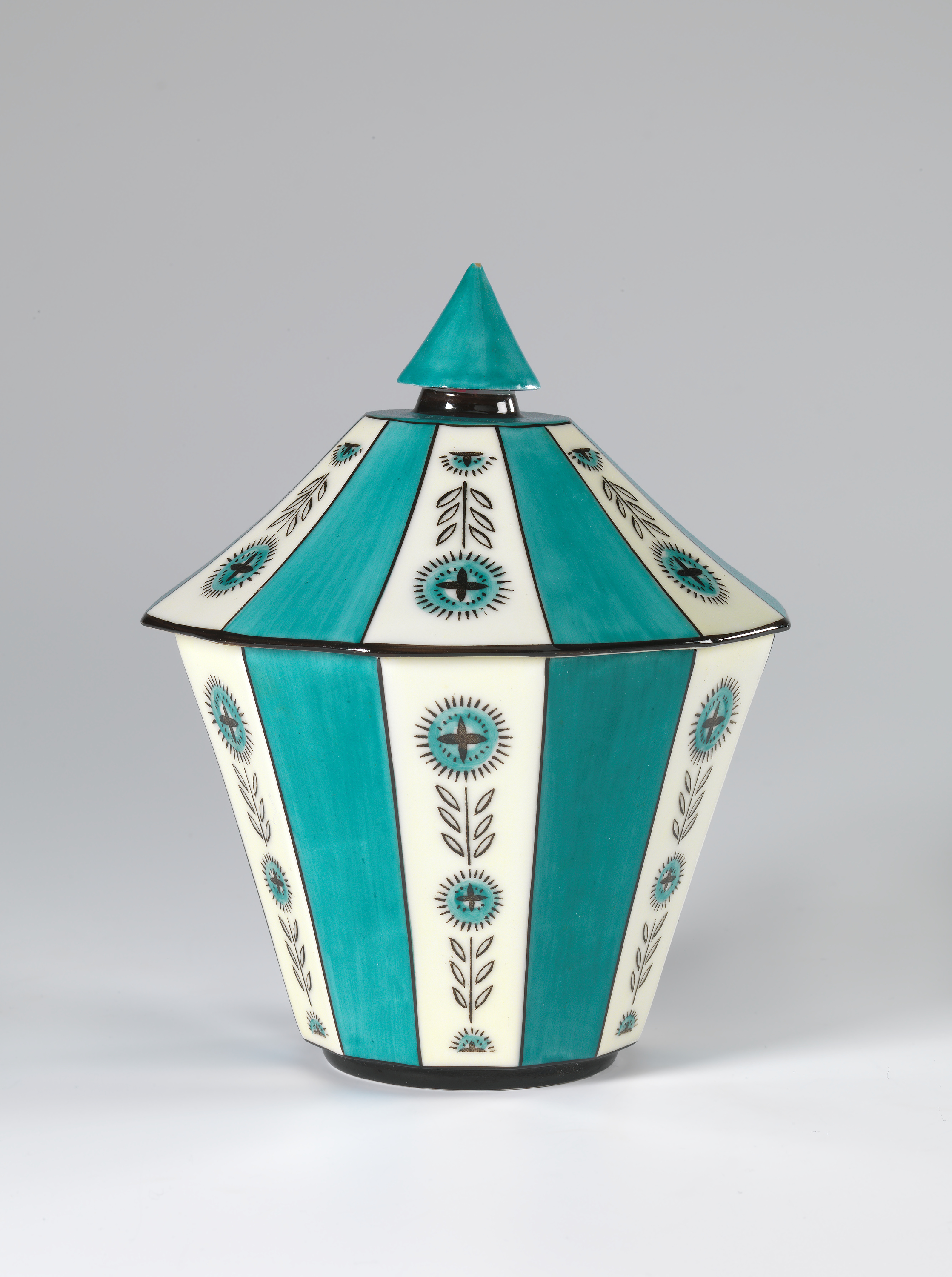 ..dette er jo porselen på en måte tatt ut av komfortsonen, dette er porselen med sterke farger og kontraster, streker, striper, strenge geometriske dekorer, skarpe farger, gullkanter. Det er det morsomme med gullkanter, kanskje tenker på det konservativt eller gammeldags. Men Nora Gulbransen la gullet ned i rillene, forgylte geometriske lokknapper så de settes som små smykker. Så Nora Gulbransen er som en fransk juveler som klarer å omsette porselenet i en ny type moderne praktgjenstand.