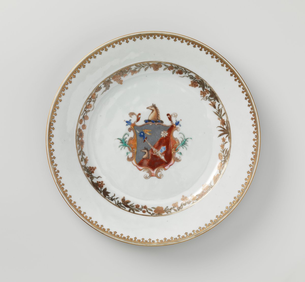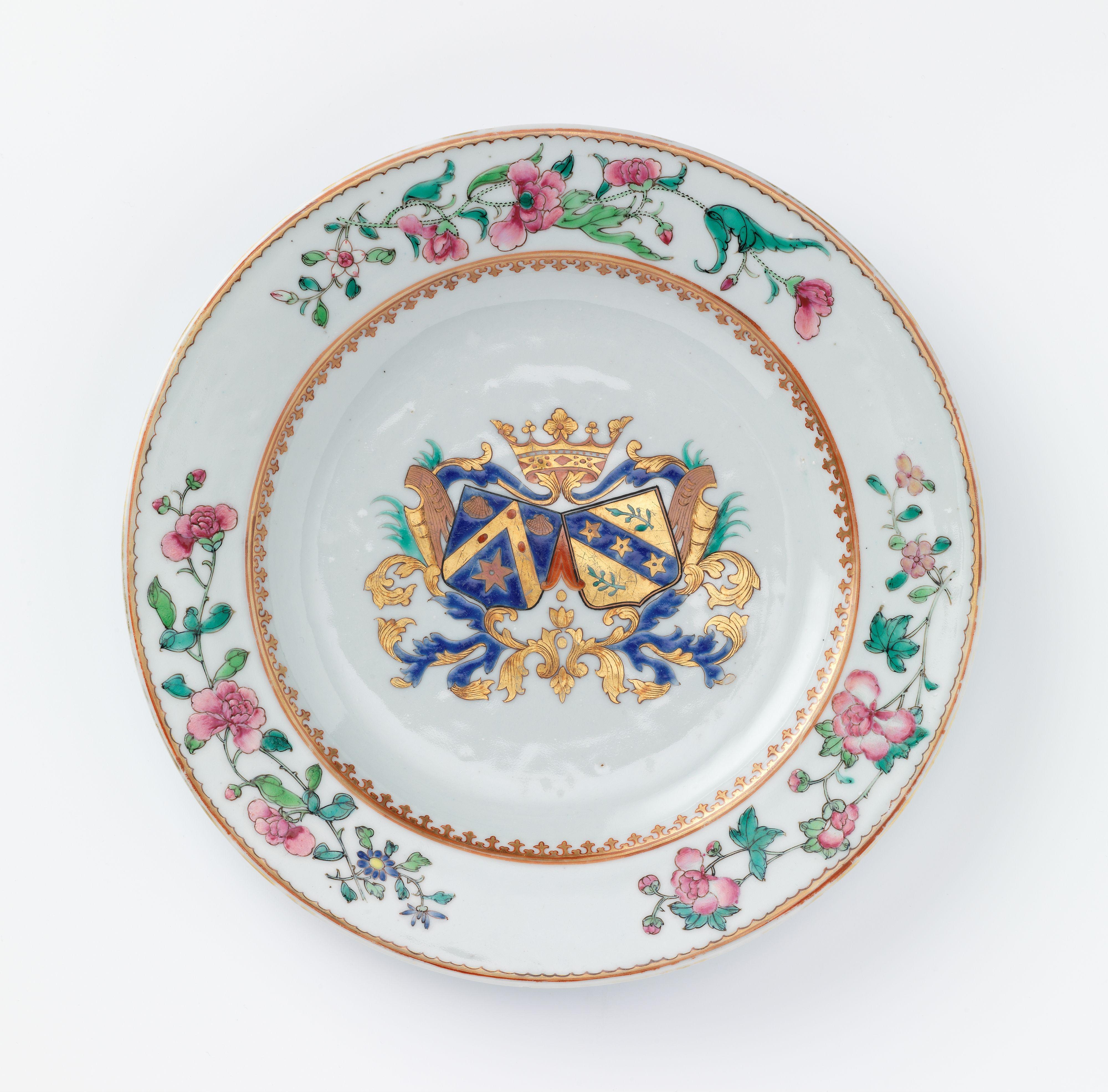 Tallerken med uidentifisert familievåpen, ostindisk, Kina, siste halvdel av 1700-tallet. Porselen med håndmalt dekor.