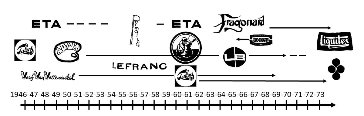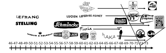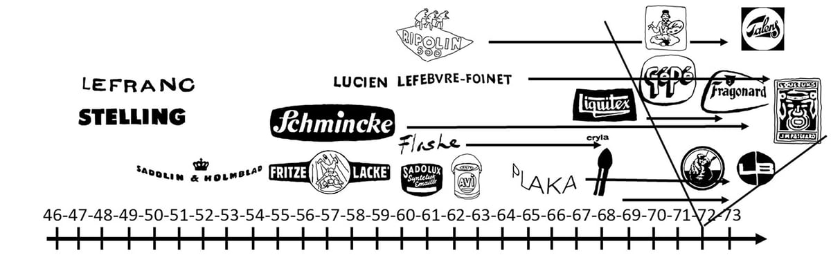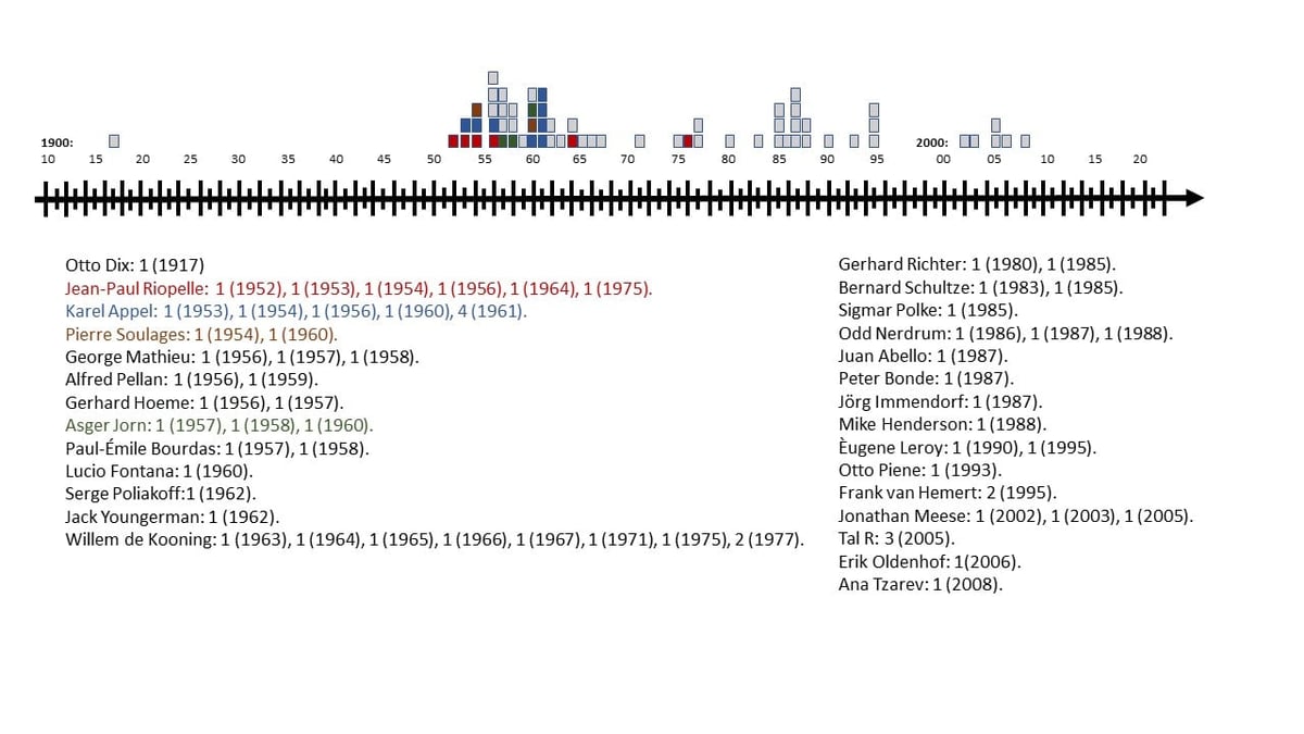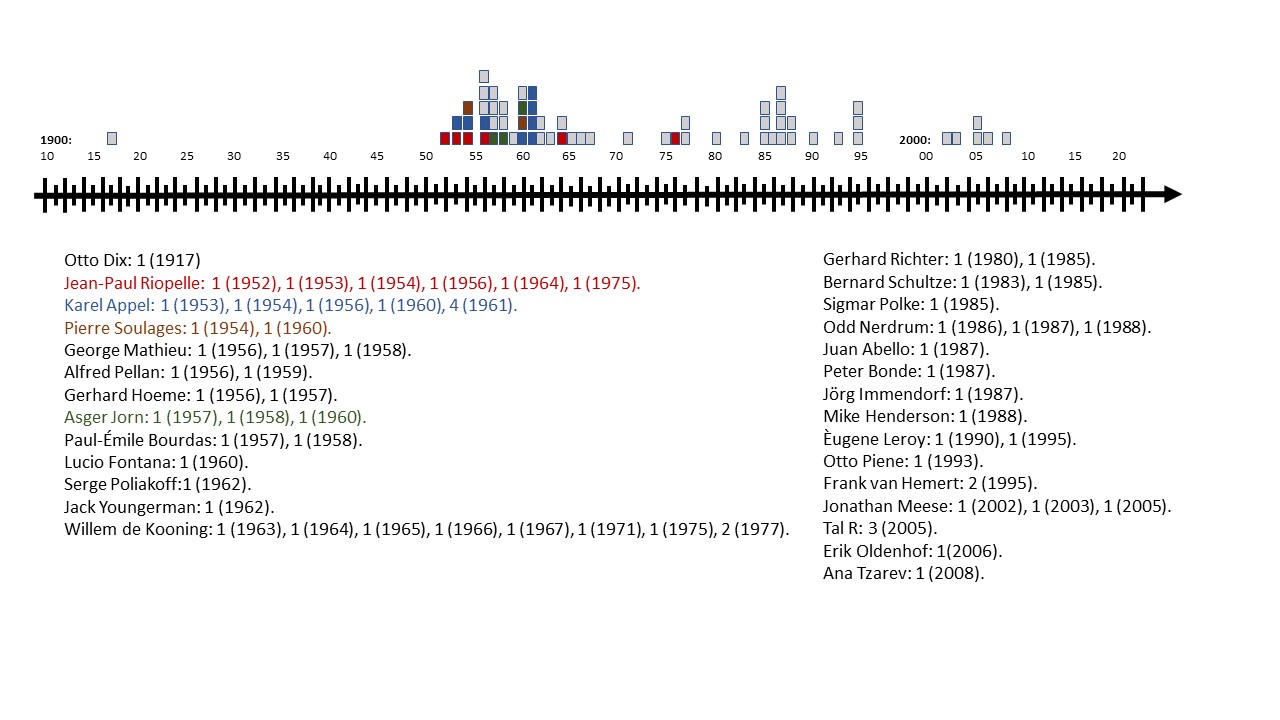 Kjente malingsmerker brukt av Asger Jorn (over) og Karel Appel (nederst) på en tidslinje.