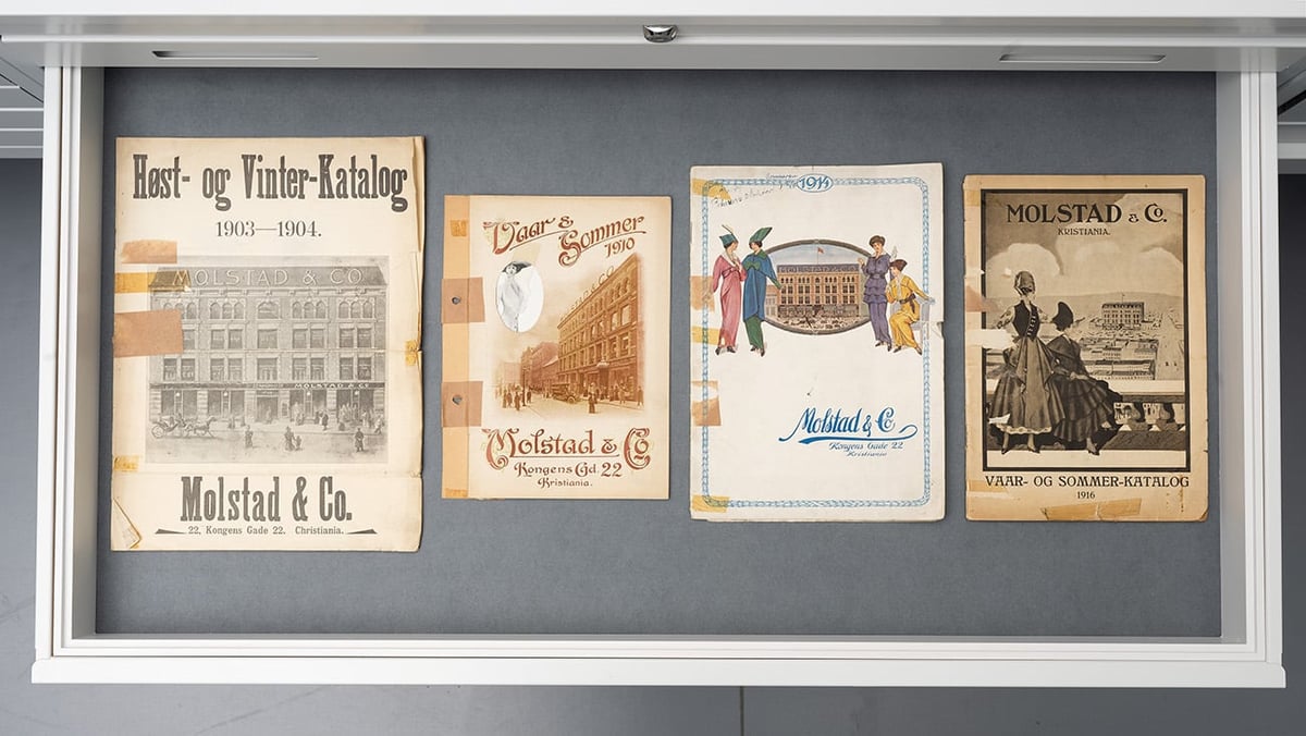 Fire av Molstads produktkataloger, slik de er stilt ut i utstillingen «Å samle på døgnfluer. Inn i motearkivet»