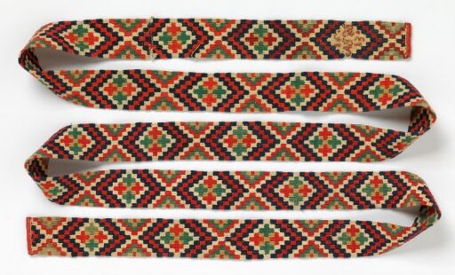 Belte Kunstner: Uidentifisert, kvinne Datering: Antagelig 1813 Betegnelse: Belte Ikke utstilt Verksinfo Datering: Antagelig 1813 Betegnelse: Belte Materiale og teknikk: Håndvevd i rutevev med åpne spalter, renning av lintråd, innslag av ulltråd. Kantet med håndvevd og valket ullstoff i toskaftbinding, håndsøm Teknikk: Veving Håndveving Rutevev Toskaftbinding Søm Håndsøm Dekorteknikk: Veving Håndveving Rutevev Brodering Håndbrodering Leggsøm Materiale: Ull Lin Mål: L 284 cm x B 4,5 cm Lengde: 248 cm Bredde: 4,5 cm Emneord: Drakttilbehør Drakt Folkekunst Klassifikasjon: 286.3 - Veving 291.42 - Drakt, voksen, kvinne 293 - Drakttilbehør 854 - Spebarnstid Produksjonssted: Telemark Inventarnr.: OK-01188 Registreringsnivå: Enkeltobjekt Ervervelse: Kjøpt 1878 Eier og samling: Stiftelsen Kunstindustrimuseet, Designsamlingene Foto: Bjørgli, Annar Utforsk lignende verk fra samlingen Uidentifisert, kvinne Belte Antagelig 1813 Utstikt mot Sundet nær København Afrodite Kallipygos Afrodite Kallipygos Statue av bakkantinne Hercules Farnese, sett forfra Herme av en gud Lysaker mølle Studie av graner Blomstrende plommegren og roser Nordisk landskap med bro Statue av stående mann. Atlas Arkitekturtegning