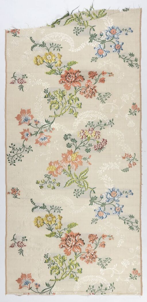 Stofflengde Kunstner: Uidentifisert Datering: 1744 eller 1745 Betegnelse: Stofflengde Ikke utstilt Verksinfo Datering: 1744 eller 1745 Betegnelse: Stofflengde Materiale og teknikk: Håndvevd silkestoff i toskaftbinding med lanserte og brosjerte innslag Teknikk: Veving Håndveving Lansert innslag Brosjert innslag Dekorteknikk: Veving Håndveving Lansert innslag Brosjert innslag Materiale: Silke Mål: L 108 x B 52 cm Bredde: 52 cm Lengde: 108 cm Emneord: Tekstil Klassifikasjon: 286.3 - Veving 286.95 - Tekstilproduktene og deres bruk 531.1 - Formgiving Motiv: Flora Produksjonssted: Spitalfields London Storbritannia Inventarnr.: OK-06566A Registreringsnivå: Enkeltobjekt Ervervelse: Gave 1901 Eier og samling: Stiftelsen Kunstindustrimuseet, Designsamlingene Foto: Anne Hansteen "Stofflengde" relaterer til: Stofflengde Utforsk lignende verk fra samlingen Uidentifisert Stofflengde 1744 eller 1745 Hulmål Herme av en gud Terrin Stofflengde Billedteppe Navneduk Kaffekanne Sett med fire lysestaker Lokk Portrett av en mann Terrin Stofflengde