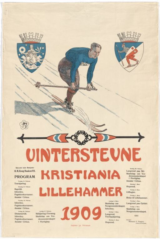 Vinterstevne Kristiania - Lillehammer 1909 Kunstnere: Andreas Bloch Kristiania Lith. Aktiebolag (Produsent av avbildet gjenstand) Datering: 1909 Betegnelse: Plakat Ikke utstilt Kunstnere/produsenter Andreas Bloch Billedkunstner, Maler Født 29.07.1860, død 11.05.1917 Kristiania Lith. Aktiebolag Verket er fra Verksinfo Datering: 1909 Betegnelse: Plakat Materiale og teknikk: Fargelitografi på papir Teknikk: Fargelitografi Materiale: Papir Mål: 86,2 x 57,2 cm Emneord: Grafisk design Klassifikasjon: 446 - Salgsarbeide og reklame Motiv - sted: Oslo Lillehammer Inventarnr.: OK-17648 Registreringsnivå: Enkeltobjekt Ervervelse: Ukjent ervervelsesår, før 1998 Eier og samling: Stiftelsen Kunstindustrimuseet, Designsamlingene Foto: Andreas Harvik Utforsk lignende verk fra samlingen Kristiania Lith. Aktiebolag Andreas Bloch Plakat 1909 Vårflom Villa Otium. Plan av 1. etasje Kopp med skål 3591 Krematorium på Vestre gravlund Stol Villa for generalkonsul Olsen Gravkapell på Eidsvold kirkegård Villa for generalkonsul Olsen Villa for generalkonsul Olsen Villa Alicia Villa Alicia