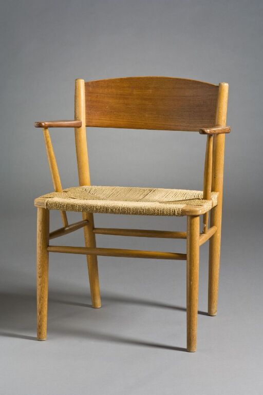 Nr. 15 Kombinasjonsstolen Kunstnere: Aandals Møbelfabrikk (Produsent av avbildet gjenstand) Børge Mogensen Søborg Møbelfabrikk (Lisensgiver) Datering: 1955 (design 1952) Betegnelse: Armstol Ikke utstilt Kunstnere/produsenter Aandals Møbelfabrikk Børge Mogensen Designer Født 13.04.1914, død 05.10.1972 Søborg Møbelfabrikk Møbelprodusent Verksinfo Datering: 1955 (design 1952) Betegnelse: Armstol Materiale og teknikk: Eik, teak og kryssfiner finert med teak, fernissert, flettet sjøgress Teknikk: Fletting Tapping Dekorteknikk: Finering Fernissering Materiale: Eik Kryssfiner Teak Sjøgress Mål: H 77 x B 57,5 x D 47 cm Dybde: 47 cm Bredde: 57,5 cm Høyde: 77 cm Emneord: Design Møbel Klassifikasjon: 322.48 - Møbeldesign 352.1 - Sittemøbler Stilperiode: Scandinavian Design Produksjonssted: Ski København Danmark Inventarnr.: OK-2001-0198 Registreringsnivå: Enkeltobjekt Ervervelse: Kjøpt 2001 Eier og samling: Stiftelsen Kunstindustrimuseet, Designsamlingene Foto: Børre Høstland Utforsk lignende verk fra samlingen Børge Mogensen Armstol 1955 (design 1952) Fat "Pingviner" Sukkerkopp Glohane Form Polynesia Lysestake Meditasjon Bordklokke Villa Stendahl Brosje Fat
